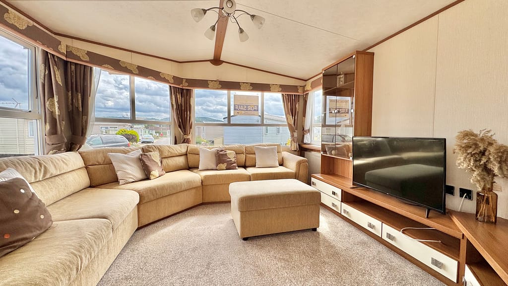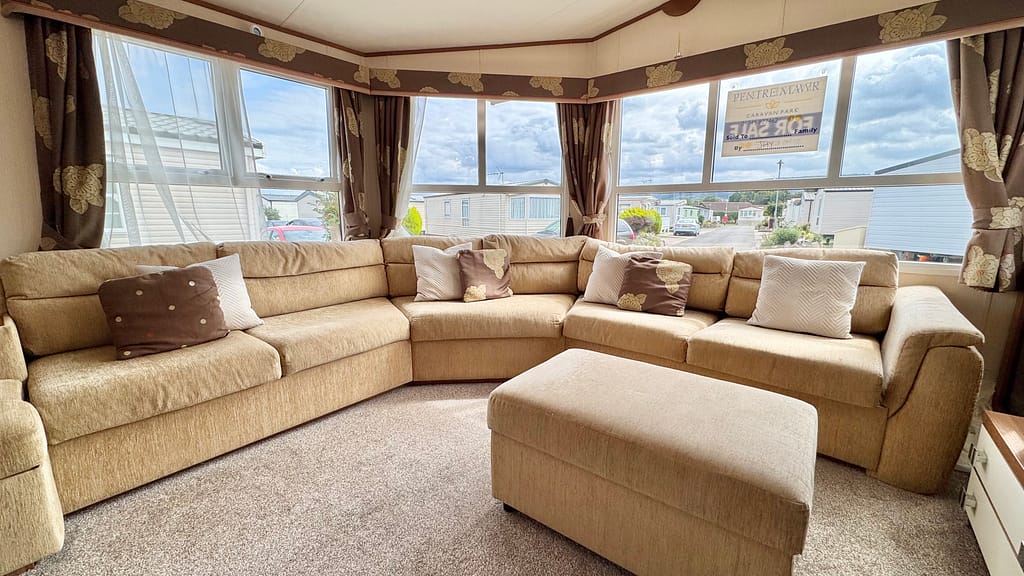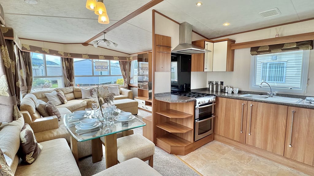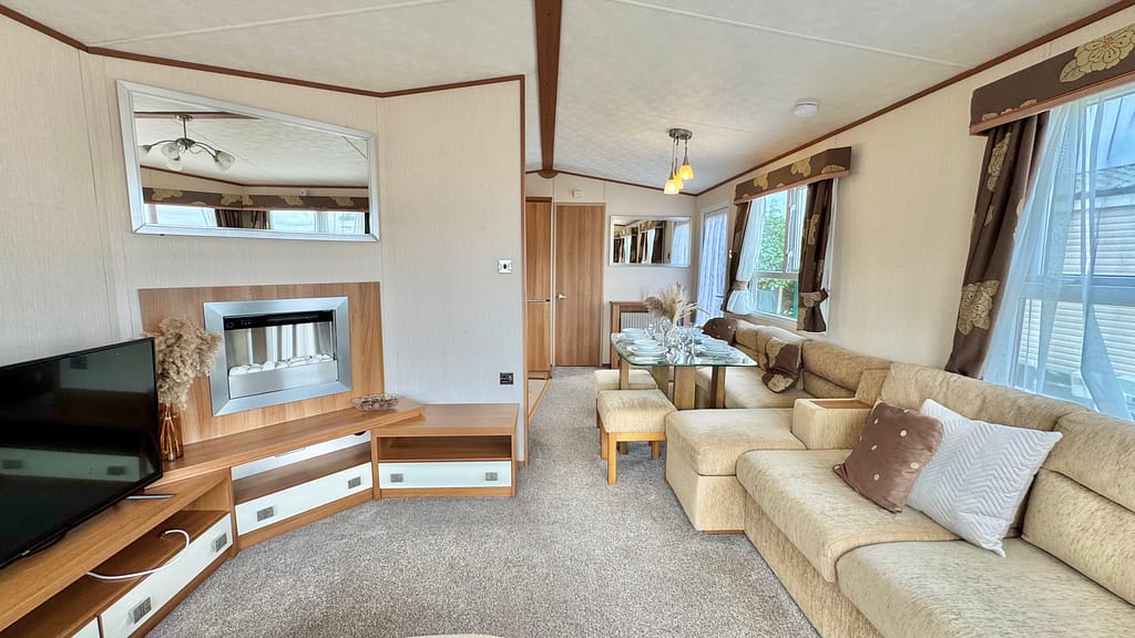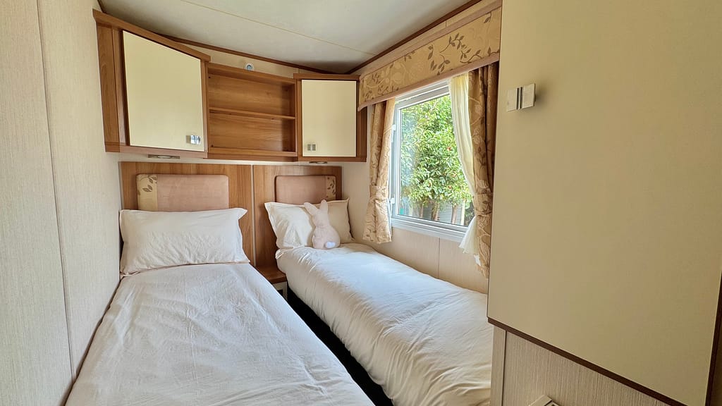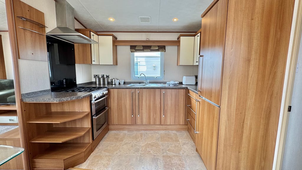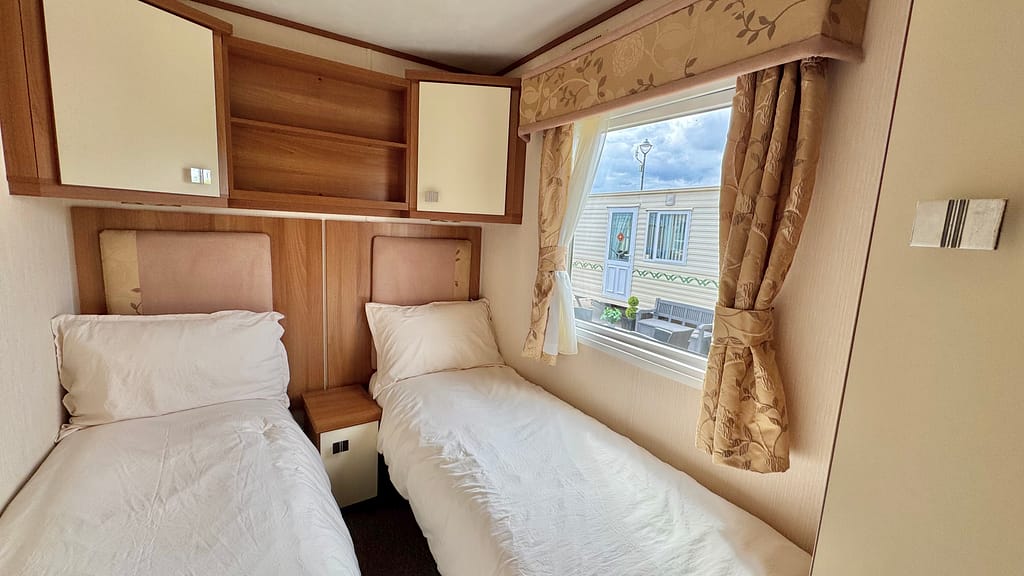 Description: The ABI Connoisseur 2010 3-bed static caravan is a spacious and stylish holiday home, measuring around 38ft x 12ft, with full central heating and double glazing throughout. It features a bright front lounge with a corner window, electric fire, and elegant cabinetry, while the kitchen comes fully equipped with a hob, oven, extractor fan, and integrated fridge/freezer. The master bedroom includes a ottoman double bed and generous storage, complemented by two single rooms with matching French walnut and cream furnishings. A rectangular shower cabin and separate toilet complete the setup, making it a comfortable and practical choice for families and couples.