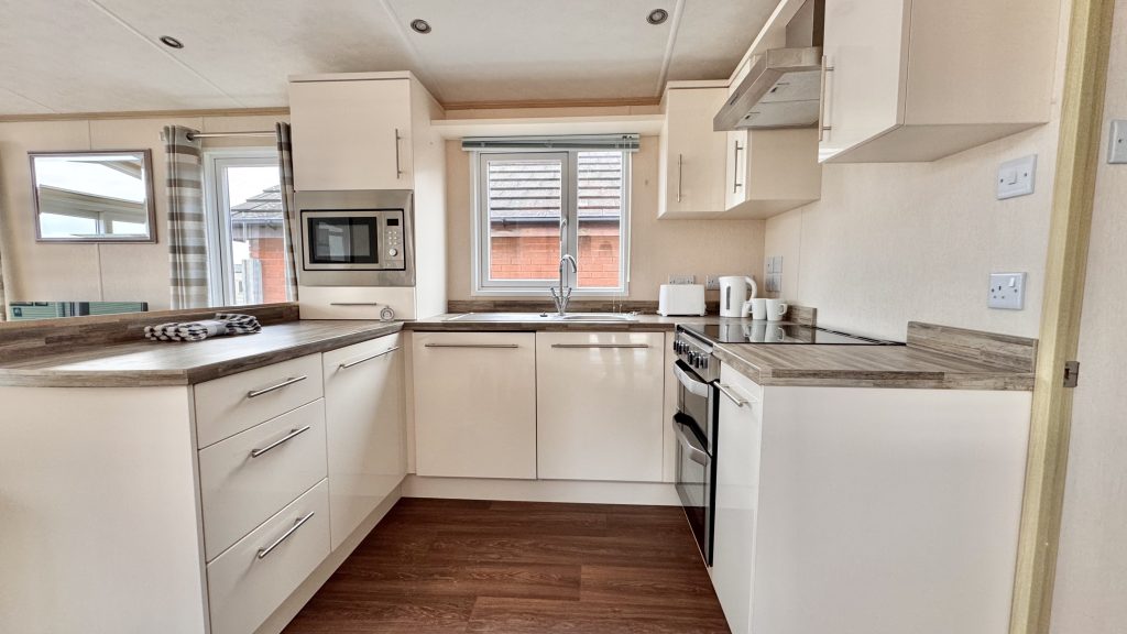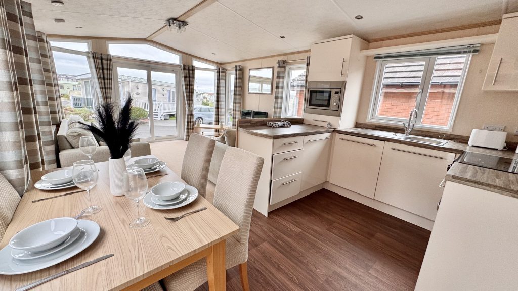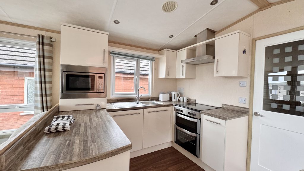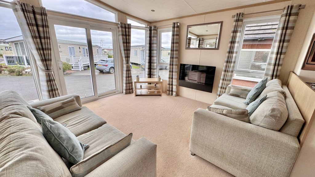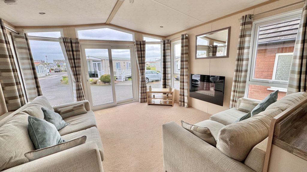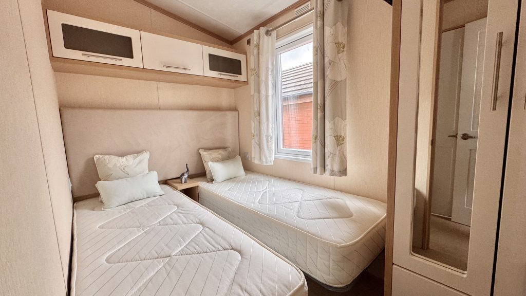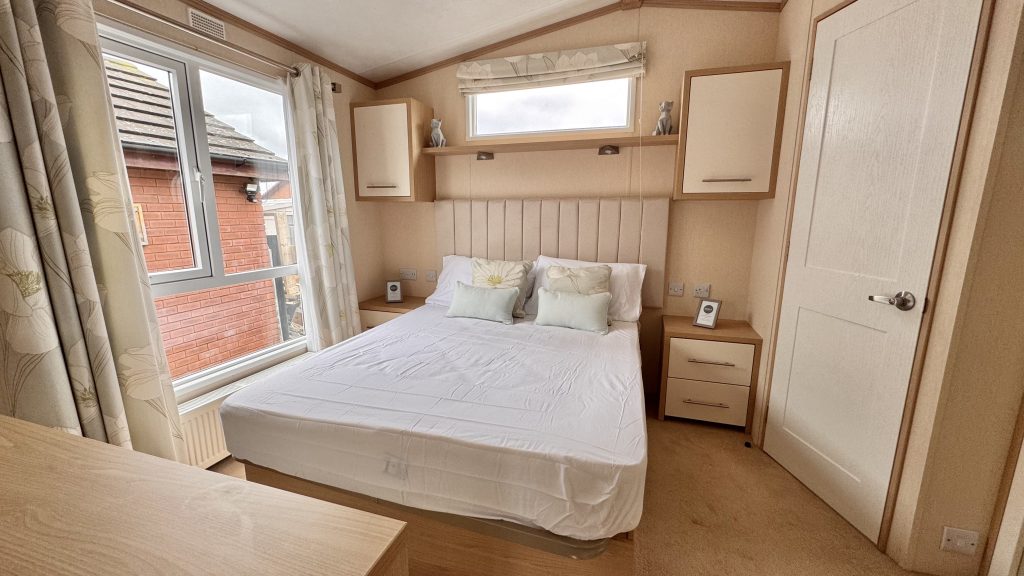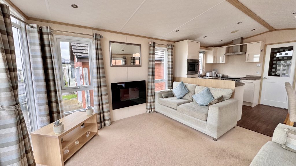 Features: • 38 x 12 two‑bedroom layout • Integrated washing machine included • Spacious lounge with large windows for plenty of natural light • Comfortable seating and stylish electric fire • Well‑equipped kitchen with generous storage and worktop space • Dining area with free‑standing table and chairs • Master bedroom with excellent wardrobe space • Twin bedroom ideal for guests or family • Double glazing and gas central heating • High‑quality Pemberton build and finish throughout • Warm, homely interior design with a premium feel