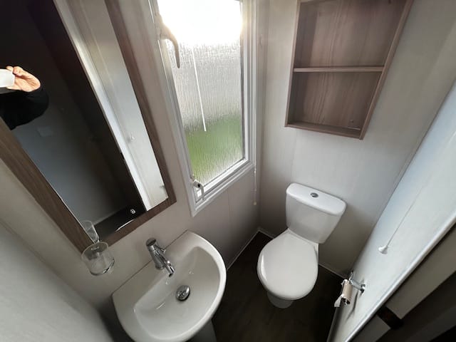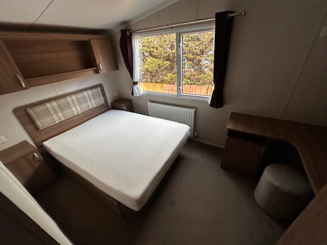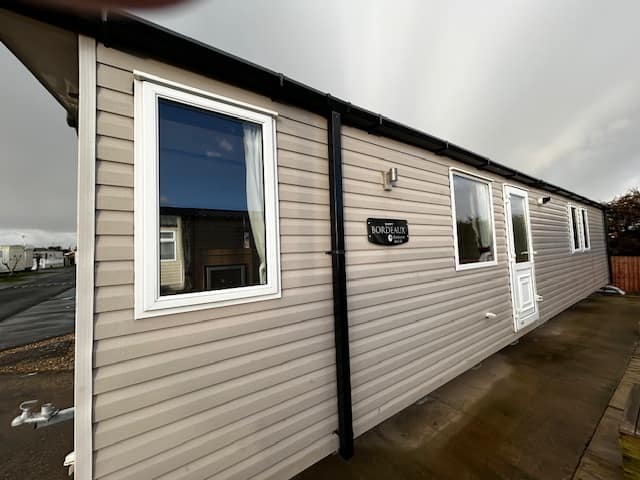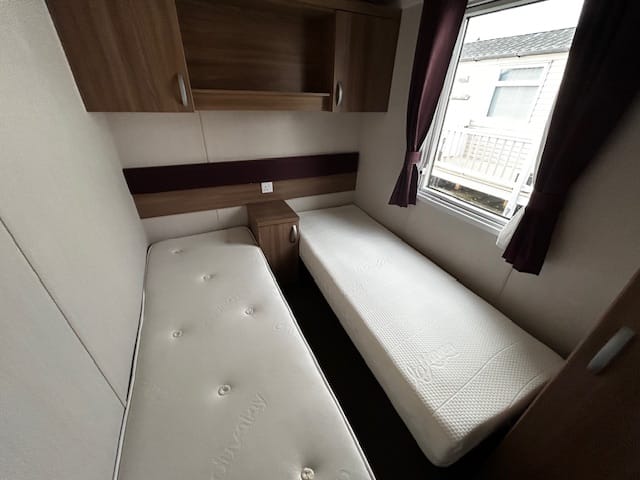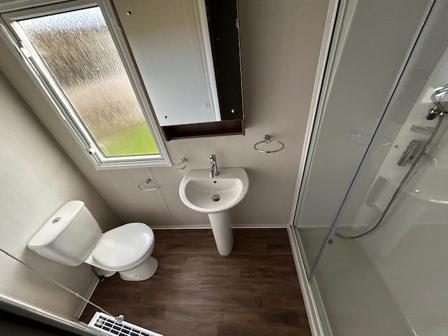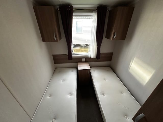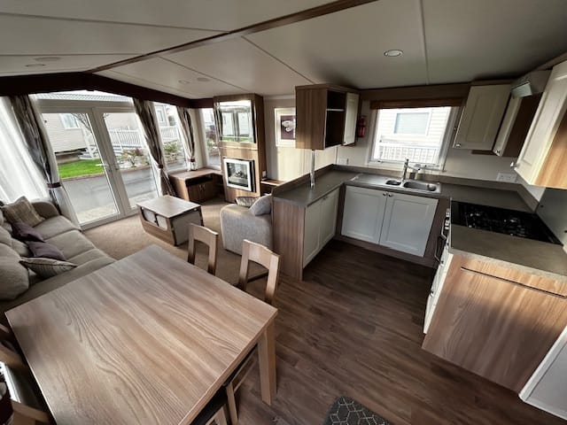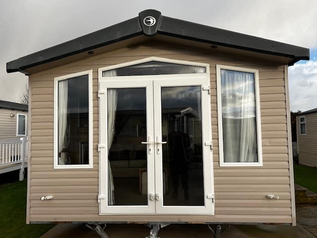 Description: This holiday home features front opening doors, double glazing, central heating, and an en-suite WC. The lounge has luxury soft furnishings, including pull-out bed sofas. The U-shaped kitchen offers ample space, integrated appliances, and a dining table. The main bedroom includes a double bed, en-suite WC, and plenty of storage. The twin room has headboards, over-bed storage, and a wardrobe.