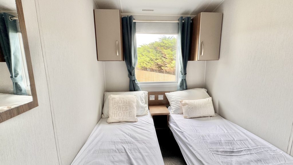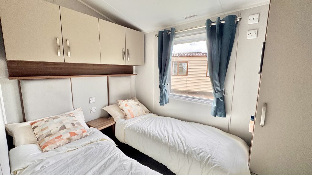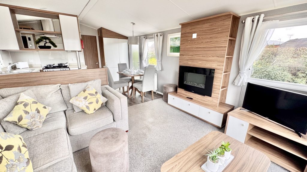 Features: - 40ft x 13ft – an expansive footprint offering exceptional comfort - Front sliding patio doors opening the lounge to the outdoors and flooding the space with natural light - Contemporary open‑plan lounge with free‑standing furniture, feature fireplace, and large windows - Modern kitchen with integrated appliances, ample storage, and a practical layout ideal for family living - Spacious master bedroom with wardrobes, dressing area, and en‑suite WC - Twin bedroom perfect for guests or children - Family shower room with quality fittings and a clean, modern finish - Double glazing & central heating for cosy year‑round use - High‑quality Willerby build known for durability and comfort